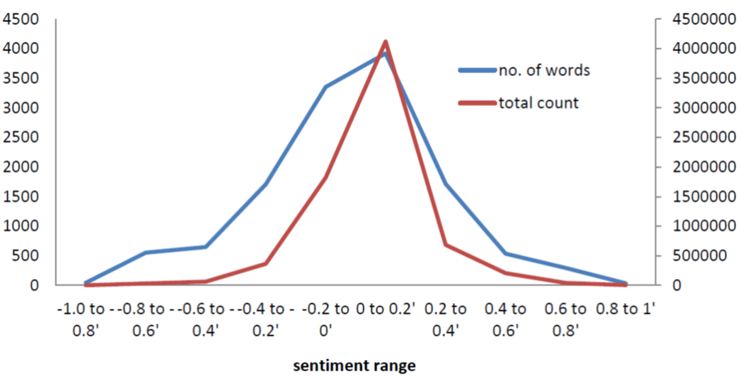 Figure 2 is same data represented as a “rate”. The rate of using a neutral or slightly positive word is greater than the rate of using a word of any other sentiment “category”. Slightly negative words are used more often than slightly positive words. But positive words between 0.2-0.4 are used way more often than negative words between sentiment -0.2 to -0.4.